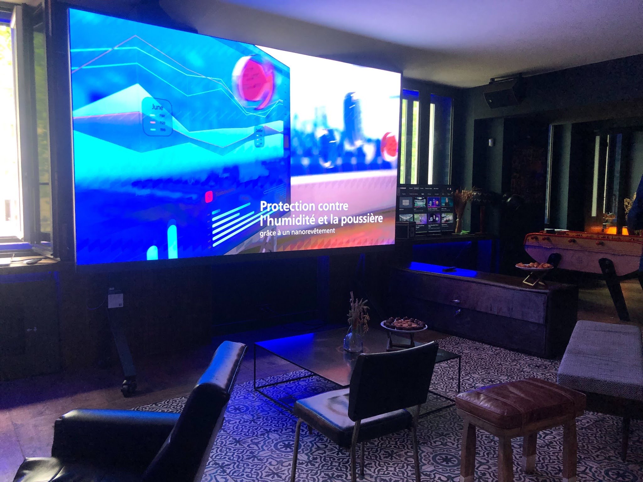 Pour ce showroom, les produits PPDS ont été intégrés au cœur du dispositif : écran LED transformé en scène d’animation musicale, affichage dynamique sur les nouveaux modèles pour guider les participants, ou encore diffusion de contenus immersifs.